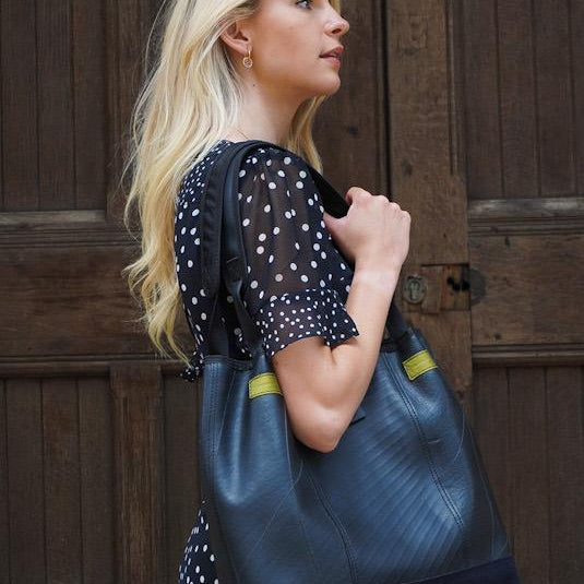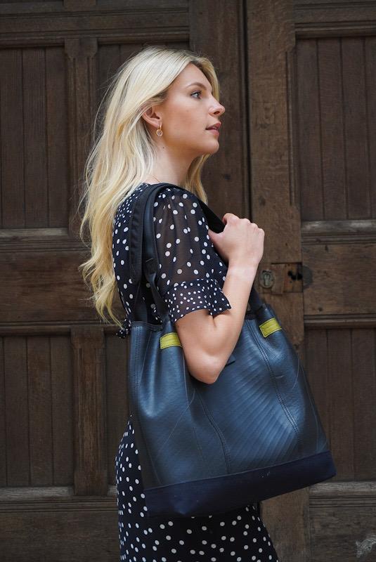 Stattdessen werden sie von Transportunternehmen in Indonesien zurückgewonnen, um zu Taschen, Schmuck und anderen Accessoires verarbeitet zu werden. Die vielfältige Textur des Gummis verleiht jedem Artikel einen unverwechselbaren Charakter und obwohl wiederverwendet, bleibt das Material äußerst strapazierfähig.